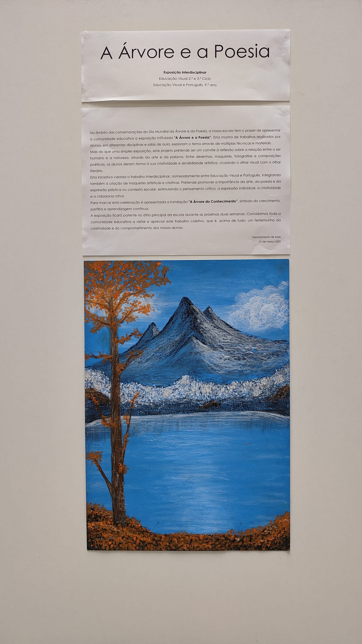 A exposição realizada no no âmbito das comemorações do Dia Mundial da Árvore e da Poesia, é uma mostra de trabalhos realizados por alunos, em diferentes disciplinas e salas de aula, exploram o tema através de múltiplas técnicas e materiais.